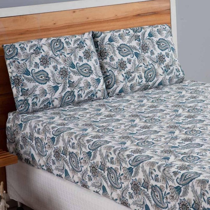 Jogo de Lençol Usual Estampado Casal Queen 3 Peças Percal 180 Fios - Azul Ramos Floral