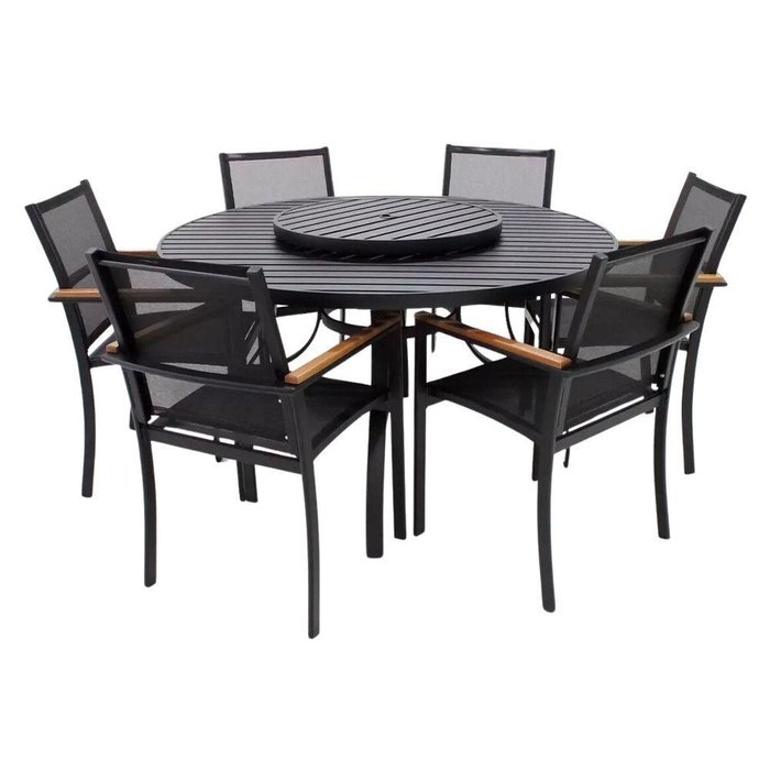 O Conjunto de Mesa Ripada de Alumínio com Centro Giratório e 6 Cadeiras de Alumínio com Tela Sling e Detalhe de Madeira, a escolha perfeita para quem busca aliar sofisticação e funcionalidade em espaços ao ar livre ou internos.