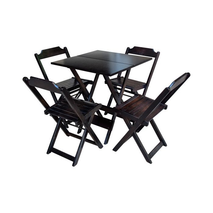 Jogo de Mesa de Madeira 70x70 com 4 Cadeiras Tabaco O Jogo de Mesa de Madeira 70x70 com 4 Cadeiras Tabaco é ideal para bares, restaurantes, estabelecimentos, áreas de lazer e tambem para sua casa. Feito em madeira maciça, tornando resistentes e duráveis. Seu design permite que seja encaixado em qualquer ambiente, trazendo um toque a mais para seu estabelecimento. Além de sua durabilidade, o que lhe trará conforto para servir seus clientes. Por ser dobrável torna-se mais fácil guardar, manusear e limpar o produto. Atenção: EVITE USAR PRODUTOS ABRASIVOS E QUÍMICOS PARA LIMPEZA DO PRODUTO, aconselha-se o uso de pano umedecido para melhor conservação; mantenha o produto fora de chuva e sol constantes. OBS: MDF ULTRA