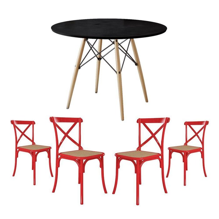 Jogo De Mesa Eiffel Redondo Tampo De Madeira 90cm Preto Com 4 Cadeiras Katrina Vermelha Assento Bege