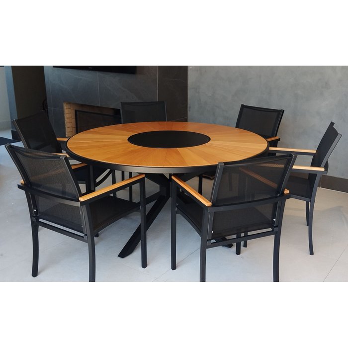 Design inovador em pétalas: um toque de sofisticação que valoriza a decoração da sua sala de jantar ou área gourmet. Amplo espaço para 6 pessoas: ideal para acomodar toda a família e amigos com conforto. Tampo de madeira maciça: a beleza natural da madeira, com resistência e durabilidade incomparáveis. Base em alumínio: leveza e robustez para garantir a estabilidade da mesa.