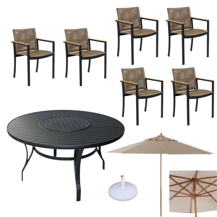 Produtos de altíssima qualidade com design moderno, garantindo assim conforto e praticidade para seu bem-estar. Produzidos em estrutura toda em alumínio, não enferruja. Acabamento da estrutura em pintura eletrostática, não descasca ou polimento. Utilizamos Fibra Sintética Tela Sling e Corda Náutica altamente resistente que possui proteção UV aumentando sua durabilidade, não resseca e nem desbota. Almofadas confeccionadas com tecido impermeável da linha ACQUABLOCK IMPERMEÁVEL da KARSTEN (caso o móvel possua almofada). ITENS INCLUSO: 1 Mesa giratória 1,40m de diâmetro + 6 Cadeiras 54x56cm + 1 Ombrelone 3,00m de diâmetro em madeira com base.