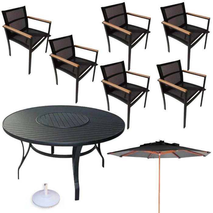 Produtos de altíssima qualidade com design moderno, garantindo assim conforto e praticidade para seu bem-estar. Produzidos em estrutura toda em alumínio, não enferruja. Acabamento da estrutura em pintura eletrostática, não descasca ou polimento. Utilizamos Fibra Sintética Tela Sling e Corda Náutica altamente resistente que possui proteção UV aumentando sua durabilidade, não resseca e nem desbota. Almofadas confeccionadas com tecido impermeável da linha ACQUABLOCK IMPERMEÁVEL da KARSTEN (caso o móvel possua almofada). ITENS INCLUSO: 1 mesa com tampo giratório 1,40m de diâmetro + 6 cadeiras + Ombrelone em madeira 3,00m de diâmetro + Base para ombrelone.