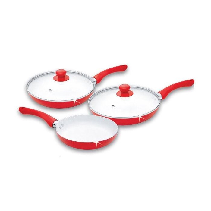Jogo de Panela Ceramica Frigideira Antiaderente Tampa Vidro 3 Peças Cozinha Sem Oleo Vermelho