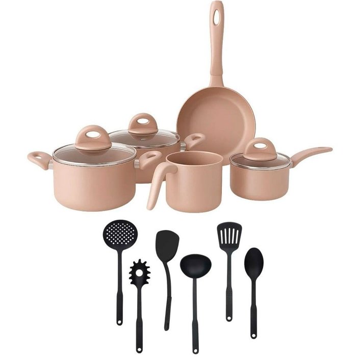 Fabricadas com revestimento marmorizado na cor Bege, as peças oferecem um visual sofisticado e moderno, além de facilitarem o cozimento sem grudar os alimentos. O conjunto é composto por caçarolas, panelas, frigideiras, utensílios e tampas com pegadores ergonômicos, garantindo conforto e segurança no manuseio.