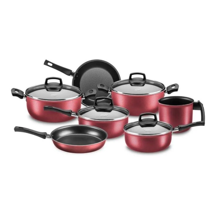 Jogo De Panela Alumínio Safira 7 Peça Antiaderente MTA Cereja 5651Nada como termos a cozinha dos sonhos, com o conjunto de panelas dos sonhos! Com Esse Jogo de Panela da MTA sua cozinha irá se tornar o melhor cômodo da casa são 5 camadas de antiaderente, que proporciona maior resistência a abrasão, maior durabilidade e maior antiaderência, além de ser livre de PFOA, Chumbo e Cádmio. Seu cabo em baquelite, dão mais segurança e versatilidade, isso lhe dará muito mais conforto na hora de manusear suas panelas, dando mais praticidade para o preparo de suas receitas e ainda temos a tampa em vidro temperado com saída de ar, permite acompanhar o cozimento de suas receitas. Indicadas para fogão a gás, eletrônico e vitrocerâmico. Fazer deliciosas receitas nunca ficou tão fácil e prazeroso.Conjunto com 1,2mm de espessura.Conteúdo do Jogo01 Fervedor Sem Tampa: Comprimento 12cm | Altura 11cm | Litragem 1,2 Litros01 Caçarola: Comprimento 22cm | Altura 10cm | Litragem 3,3 Litros01 Frigideira: Comprimento 22cm | Altura 5cm | Litragem 1,4 Litros01 Frigideira: Comprimento 20cm | Altura 4cm | Litragem 0,9 Litros01 Caçarola: Comprimento 20cm | Altura 9cm | Litragem 2,4 Litros01 Panela: Comprimento 18cm | Altura 8cm | Litragem 1,7 Litros01 Panela: Comprimento 16cm | Altura 7cm | Litragem 1,4 LitrosOrientaçõesInstruções de Uso: Aconselhamos a não usar as panelas sem óleo, sempre uma colher pequena de manteiga ou óleo pode ser usada a seu critério para dar um sabor a seu gosto, e evitar que o revestimento queime.Conselhos de Utilização: Utilize somente utensílios de madeira, nylon ou silicone. Evite cortar alimentos diretamente na panela. Não risque a superfície antiaderente. Pequenos riscos ou marcas de abrasão são normais e não afetam a desempenho do revestimento antiaderente. Não deixe sua panela vazia no fogo. Evite que a chama incida sobre a lateral da panela. Deixe sua panela esfriar antes de lavar. Recomendamos sempre utilizar fogo brando, fogo alto é desnecessário e pode danificar a panela.Antes do primeiro uso: Remova etiquetas. Lave o utensílio com detergente e água morna. Seque. Utilize um pano macio ou papel toalha para passar um pouco de óleo no revestimento antiaderente no interior do utensílio. Leve ao fogo baixo durante dois minutos. Deixe esfriar. Lave e seque novamente.