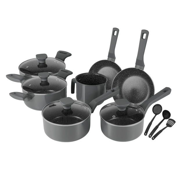 Composto por 2 Caçarolas com tampa, 2 Panelas com tampa, 2 Frigideiras sem tampa, 1 Leiteira, 1 Espátula vazada preta, 1 Concha preta e 1 Escumadeira preta.