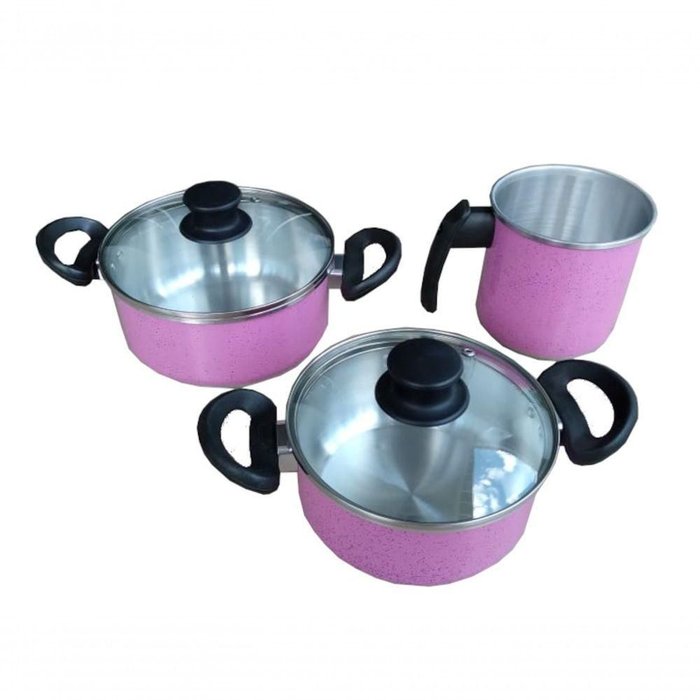Conjunto de panelas de aluminio grosso cor rosa pigmentado.Com tampa de vidro temperado.Marca: Docesar, a 50 anos na fabricação de panelas. Acompanha:1 Caneco Nº12, 1,2 Litros.1 1 Cassarola Nº16, 1,4 Litros.1 1 Cassarola Nº18. 1,9 Litros.