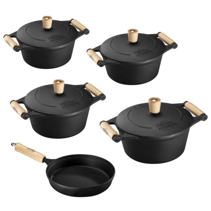 Jogo de Panelas 5 Peças em Ferro Fundido e Alça de Madeira Panela Mineira