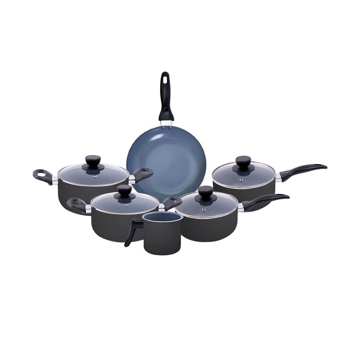 as panelas e caçarolas são de alumínio, cerâmica, aço inox, vidro temperado e baquelite. a frigideira e a leiteira são de alumínio, cerâmica e baquelite.