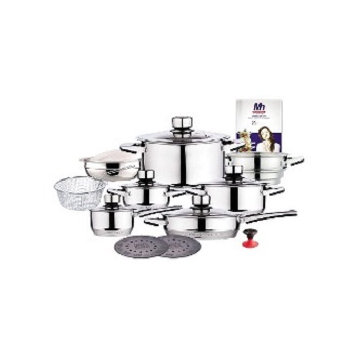 Este Conjunto de Panelas em aço Cirúrgico contém 19 peças e é composto de: