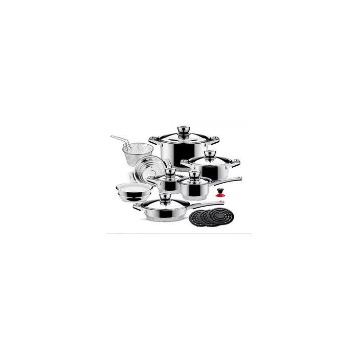 Marca: Dusseldorf Principais Atributos:As panelas são compostas por 9 camadas metálicas que geram alta transferência de calor para os alimentos, e permitem elevada conservação do calor adquirido por mais tempo.Sendo: 4 camadas de alumínio, 2 de aço cirúrgico, 1 de aço para indução, 2 de alumínio puro.O termômetro na tampa das panelas indica a temperatura interna, proporcionando o cozimento perfeito. Design inovador que favorece técnicas de cozimento sem água e fritura sem gorduras, utilizando apenas o próprio sumo do alimento. A distribuição de calor acontece de modo mais rápido e uniforme no fundo da panela.Projeto estéril para evitar a proliferação de microorganismos após a limpeza. Panelas antiaderente que evitam a queima de alimentos. Panelas versáteis adequadas para cada tipo de cozimento. Fechamento hermético, que conserva o calor e gera fluxo de vapor/condensação que acelera o preparo. Funcionam em qualquer fogão, inclusive de indução.Método de Limpeza:Lave com água quente para remover mais facilmente a sujeira. Utilize sempre uma esponja ou pano macio e detergente neutro. Também podem ser levadas em máquina de lavar louça. Seque a panela com um pano macio para evitar manchas e arranhões.ATENÇÃO: Utilize luvas antes de tocar a panela ao fogo pois as alças e cabos podem aquecer.Cuidado ao destampar a panela, pois o vapor de cozimento pode causar queimaduras. Toda panela inoxidável pode apresentar manchas ou descoloração com o tempo devido ao uso inapropriado das mesmas, como em chamas geradas por lenha ou líquidos inflamáveis (como querosene), ou causada por incidentes, como deixar a panela vazia em fogo quente, chama muito alta (que pode atingir o revestimento de aço cirúrgico) ou resíduos externos. Entretanto, esse fator não influencia no pleno funcionamento das panelas.Nunca despeje água fria na panela quente, pois o choque térmico pode causar danos ao produto. Deixe a panela esfriar naturalmente. Composição do Jogo de Panelas:1 caçarola de 6,3 litros com 1 tampa (24 x 14 cm)1 frigideira de 2,9 litros com 1 tampa (24 x 6,5 cm)1 caçarola de 1,6 litros com 1 tampa (16 x 8 cm)1 panela vaporizadora (20 x 10 cm)1 panela de 1,8 litros com 1 tampa (16 x 9 cm)1 caçarola de 3,1 litros com 1 tampa (20 x 10 cm)1 saladeira com 1 tampa plástica (20 x 6 cm)1 cesto para fritura com 3 cabo auxiliar1 botão de sucção 4 bakelitesO kit ainda contém: Catálogo, manual, cartão de certificação de fábrica, escala de volume.Os produtos possuem garantia de 12 meses para defeitos de fábrica.Peso do kit: 11,2kg