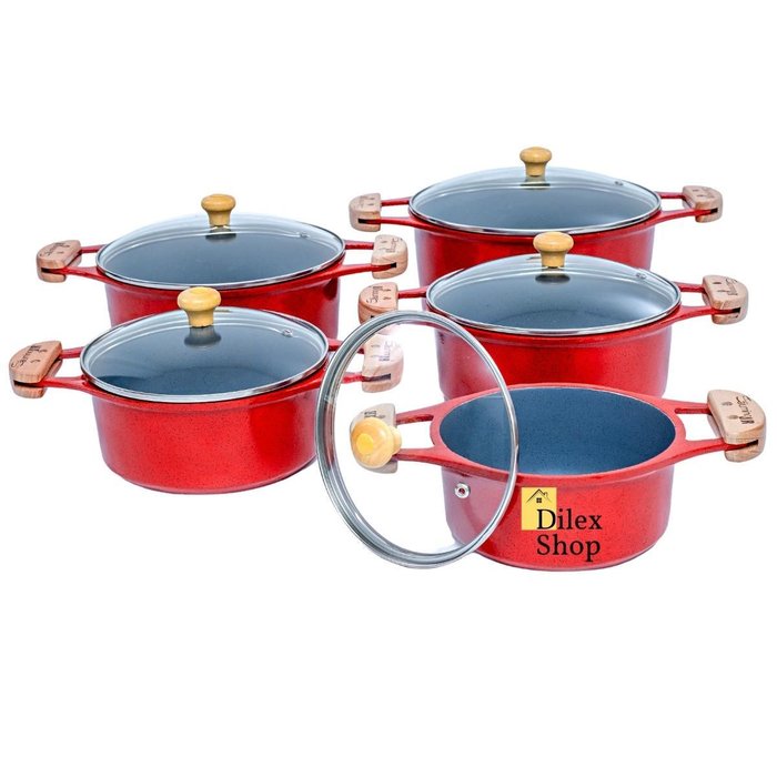 - jogo com 5 panelas em alumínio fundido revestido em cerâmica antiaderente.