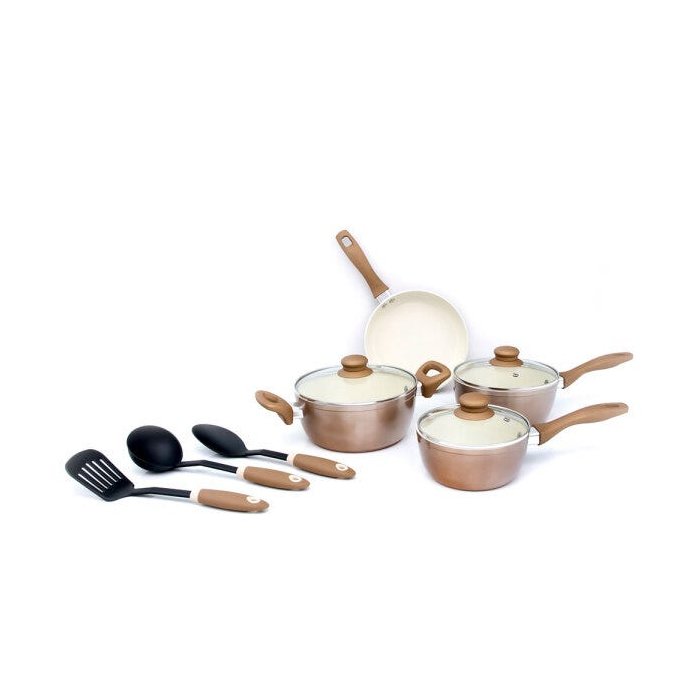 O Jogo de Panelas Ana Maria Braga com Revestimento Cerâmico 7 Peças Cobre é formado por panelas, caçarola e frigideira perfeitas para o uso diário. Altamente charmosas e apresentando uma cor estilosa, elas são feitas em alumínio forjado com espessura de 3mm e ainda recebem revestimento cerâmico que permite preparar alimentos de forma mais saudável. Trazem também tampas de vidro com saída para vapor, cabos e alças de baquelite revestidos de silicone.Acompanha 1 espátula, 1 colher e 1 concha adequadas para o contato com as peças.