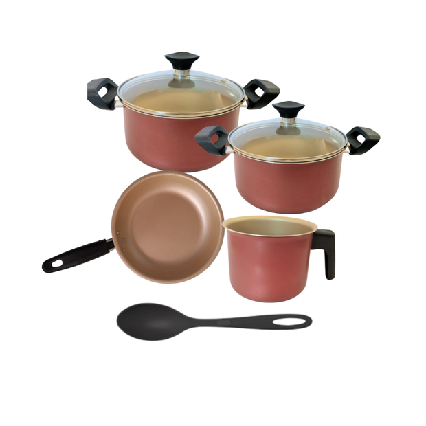 Conjunto de panelas antiaderente 5 peças: inclui 1 caçarola de 18cm, 1 caçarola de 16cm, 1 frigideira francesa, 1 canecão de 14cm e 1 colher de nylon para arroz. Ideal para cozinhas modernas, com distribuição uniforme de calor e fácil limpeza. Perfeito para o dia a dia!