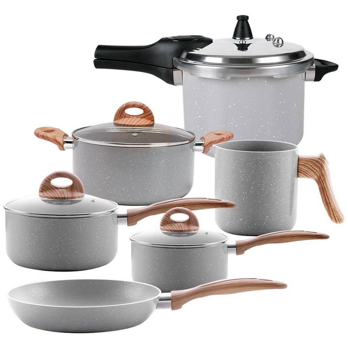 É composto por duas panelas com cabo, uma panela de pressão, uma caçarola, uma frigideira e um fervedor, todos em alumínio cinza com marble branco, com cabos de baquelite Soft-Touch na tonalidade de madeira e revestimento cerâmico na cor cinza com marble branco.