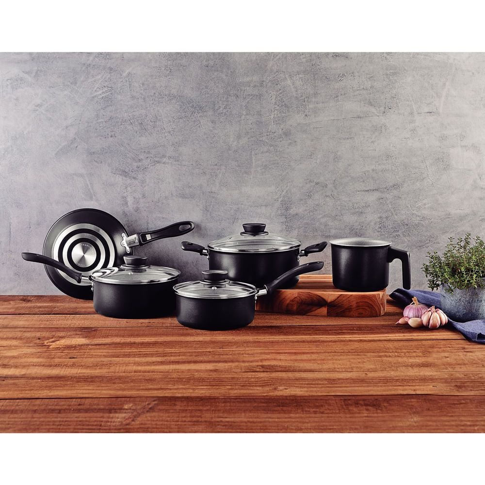 Aprimore sua cozinha com o jogo de panelas Tramontina Linz em alumínio com revestimento interno e externo em antiaderente Starflon Max preto 5 peças. Essenciais para quem não abre mão da funcionalidade na cozinha, este jogo tem peças que evitam que os alimentos grudem, mesmo cozinhando de maneira rápida e uniforme. Tudo isso, graças a produção em alumínio com revestimento interno e externo e Starflon Max. As tampas de vidro temperado com bordas de aço inox permitem acompanhar o preparo com segurança, e os cabos e alças de baquelite antitérmico, junto com os pegadores de nylon, oferecem conforto e segurança no manuseio. Além de todas essas características, o jogo pode ir em fogões a gás, elétricos e vitrocerâmicos, é lavável em máquina de lavar louças, e proporcionará toda a praticidade ao seu dia a dia na cozinha!
