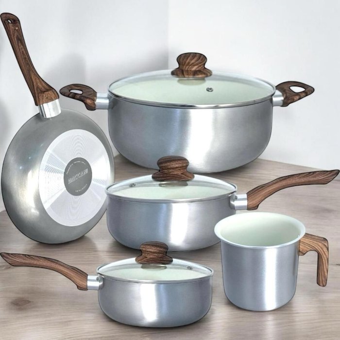 Composto por 1 Frigideira, 1 Leiteira, 2 Panelas e 1 Caçarola.