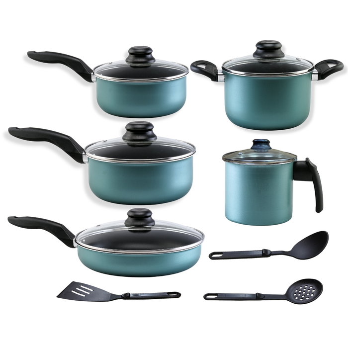 Itens: 1 Caçarola 18cm de diâmetro com tampa de vidro, 1 Panela 16cm de diâmetro com tampa de vidro, 1 Panela 18cm de diâmetro com tampa de vidro, 1 frigideira 20cm de diâmetro com tampa de vidro, 1 caneco/leiteira 14cm de diâmetro com tampa de vidro, 1 Colher, 1 Espátula e 1 Escumadeira de Nylon.