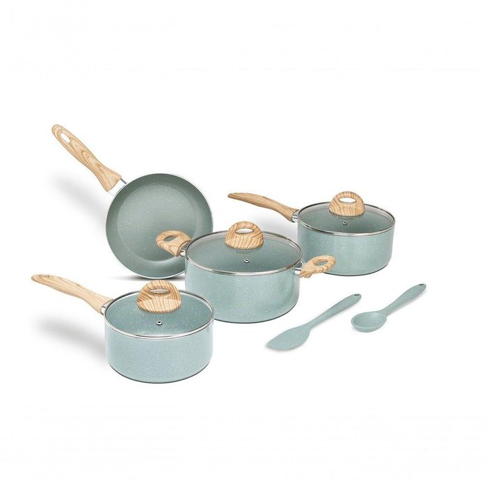 Característica-3 - MATERIAIS: o Conjunto de Panelas 6 Peças Botanika/Brinox é fabricado na cor Verde com estrutura em alumínio que cozinha por igual e mais rápido. Os cabos e alças são em baquelite soft-touch com efeito amadeirado. As tampas em vidro temperado têm saídas para o vapor. Livre de PFOA, o revestimento interno é com antiaderente Pro Ceramic e tecnologia Mineral Resist de três camadas. O fundo de indução permite a utilização em todos os tipos de fogões. A espátula e a colher são em silicone.