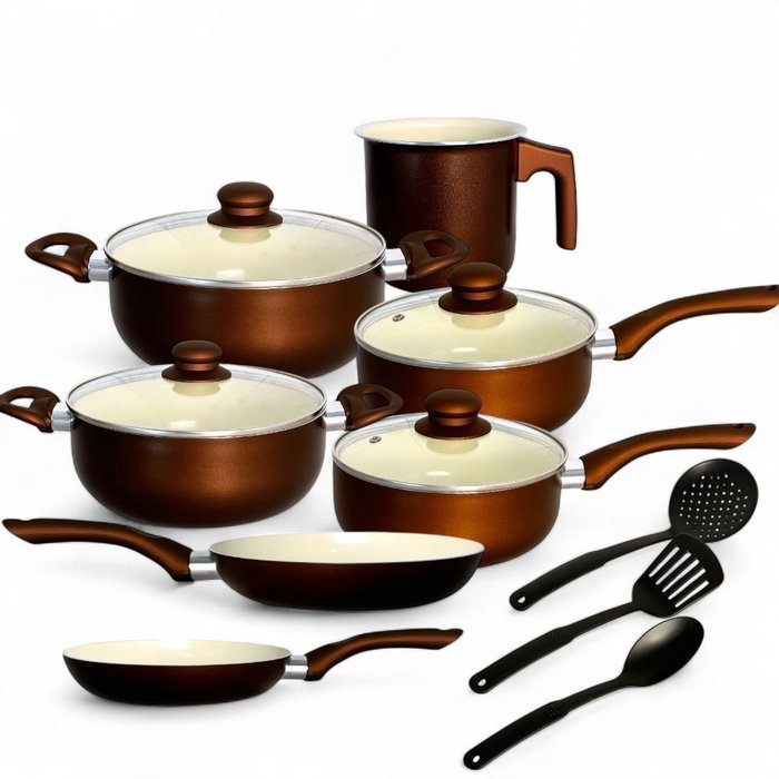 Com 1 Leiteira, 2 Frigideiras, 2 panelas, 2 Caçarolas e 3 Utensílios.