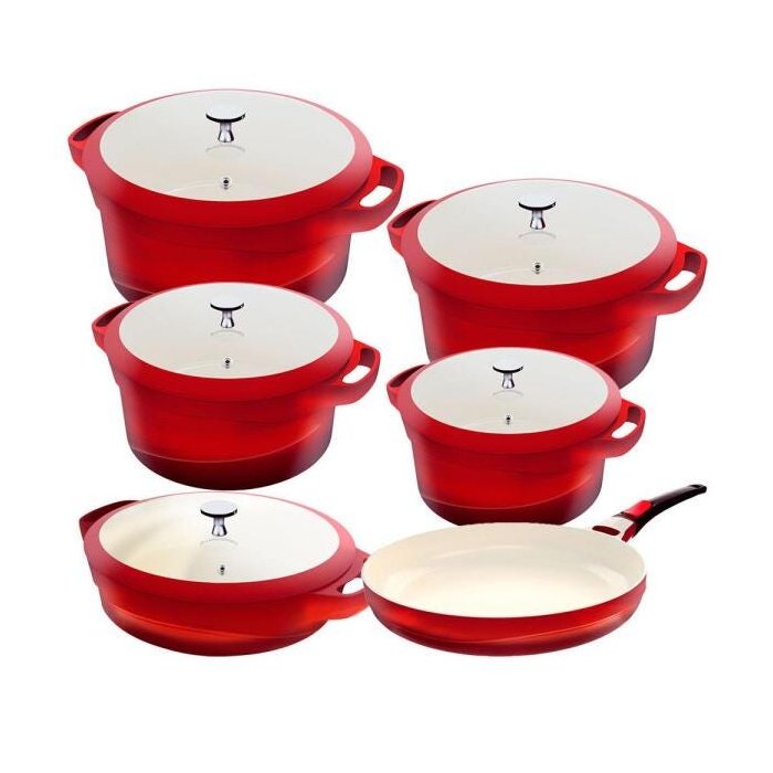 Jogo de Panelas Cerâmica 6 Pçs com Caçarola Baixa Frigideira Cabo Destacável 28cm Vai Forno Le Vermelho