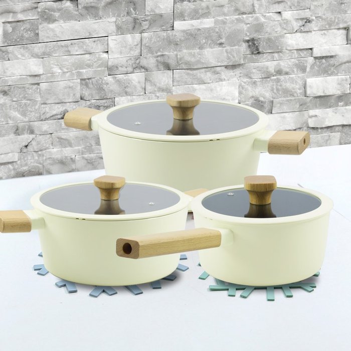 Cozinhar será muito mais prazeroso e saudável lindo jogo de panelas Danny Home Cuisine com exclusivo cabo em madeira e revestimento em cerâmica.