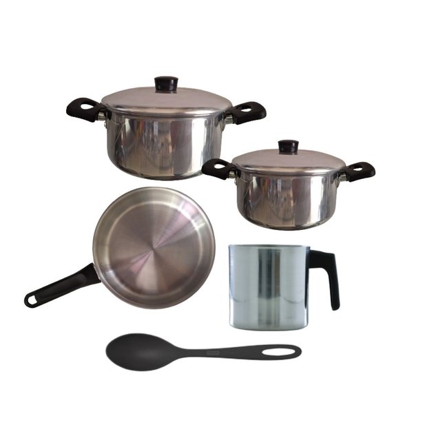 Conjunto de panelas aluminio polido reforçado 5 peças: inclui 1 caçarola de 18cm, 1 caçarola de 16cm, 1 frigideira 20 cm, 1 canecão de 14cm e 1 colher de nylon para arroz. Ideal para cozinhas modernas, com distribuição uniforme de calor e fácil limpeza. Perfeito para o dia a dia!