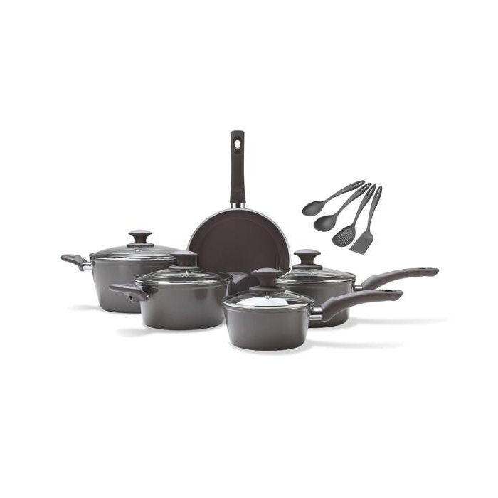 Com o Jogo de Panelas Ceramic Optima da Brinox você tem uma cozinha completa e pode preparar seus alimentos de forma mais eficiente. As panelas contam com uma estrutura mais robusta que cozinha os alimentos por igual de forma mais rápida, diminuindo o consumo de energia. Com a nova geração de antiaderente, o Mineral Resist, com particulas de cerâmica, a frigideira está mais resistente a altas temperaturas.