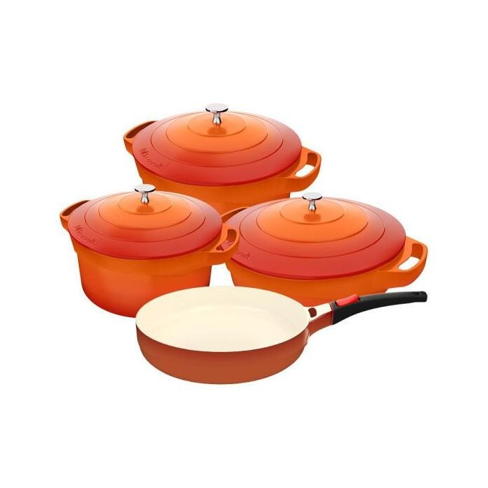 Jogo De Panelas Le Cook Com Revestimento Cerâmico - 4 PeçasEssencial para a sua cozinha, as panelas Le Cook são perfeitas para fazer cozidos e assados, como também versáteis para assar pães e bolos. São livres de elementos nocivos como o PFOA e PTFE (compostos químicos dos antiaderentes convencionais). Além disso, requer o uso de menos óleo pelo alto poder antiaderente, tornando o alimento mais saudável para toda família. Não é só uma panela: é um sonho em sua cozinha. Panela em alumínio com Revestimento Antiaderente Cerâmico PARTE EXTERNA: alumínio de alta densidade (metal com melhor condução térmica e de rápida indução). PARTE INTERNA: Revestimento antiaderente Cerâmico para melhor retenção do calor e cozimento uniforme dos alimentos.Kit composto por:4 PEÇAS:LC1802 – Caçarola Le Cook com pegadores de silicone (20cm – 2,6L) – 1 unidade;LC1803 - Caçarola Le Cook com pegadores de silicone (24cm – 4,5L) – 1 unidade;LC1806 - Caçarola Baixa Le Cook com pegadores de silicone (24cm – 2,4L) – 1 unidade;LC1807 - Frigideira Le Cook com Cabo Destacável (24cm – 1,7L) – 1 unidade.ESPECIFICAÇÕESMaterial: Alumínio com Revestimento Interno CerâmicoMedidas do Produto - dimensões aproximadas: Peso (Kg) 15kg (CxLxA): 66 x 37 x 34 cmMarca: Le CookFabricante: Marcamix - Utilidades GourmetRECOMENDAÇÕESSempre deixe a panela esfriar antes de mergulhá-la na água.Se deixar queimar os alimentos, deixe a panela de molho em água durante algum tempo antes de lavá-la.Utilize somente detergente neutro e esponja macia para fazer a limpeza.Depois da lavagem, sempre que possível, enxágue a panela com água quente e seque-a imediatamente para que mantenha o brilho original. O cloro da água morna e o detergente podem deixar manchas na panela.Durante o uso mantenha fora do alcance de crianças. Para maior segurança, mantenha o cabo sempre voltado para parte interna do fogão e nunca deixe o produto sem supervisão.PRAZO DE GARANTIAA Linha de panelas da Le Cook possui garantia de 2 anos.Importante: A garantia é limitada apenas para defeitos de fabricação. A mesma não abrange desgaste natural do produto ou uso indevido do mesmo, bem como trincas provocadas por quedas e riscos de utensílios metálicos.INSTRUÇÕES DE USORemova eventuais etiquetas e lave a panela antes de utilizá-la pela primeira vez. Na sequência, unte a superfície com óleo e aqueça-a, em fogo baixo por 2 a 3 minutos, e reserve. Após esfriar lave-a com esponja macia e detergente neutro em água morna. Enxágue bem e seque completamente.Para preservar o Revestimento antiaderente Cerâmico não utilize utensílios com pontas metálicas. Recomendamos usar apenas utensílios de nylon, madeira ou Silicone.Sempre use fogo baixo ou médio quando cozinhar alimentos, isso ajuda a preservar seus nutrientes e também a conservar a superfície do Revestimento antiaderente Cerâmico. Recomendamos o uso de pouco óleo para o cozimento de alimentos.Quando a panela for utilizada no fogão a gás, a chama não deve ultrapassar a base da panela. No caso de chama elétrica, ela deverá ter diâmetro igual ou inferior ao da panela.O Revestimento antiaderente Cerâmico é perfeitamente seguro para o uso na máquina de lavar louça. A lavagem manual também ocorre de forma muito fácil devido à sua característica de antiaderência, utilizando sempre sabão neutro e esponja macia.