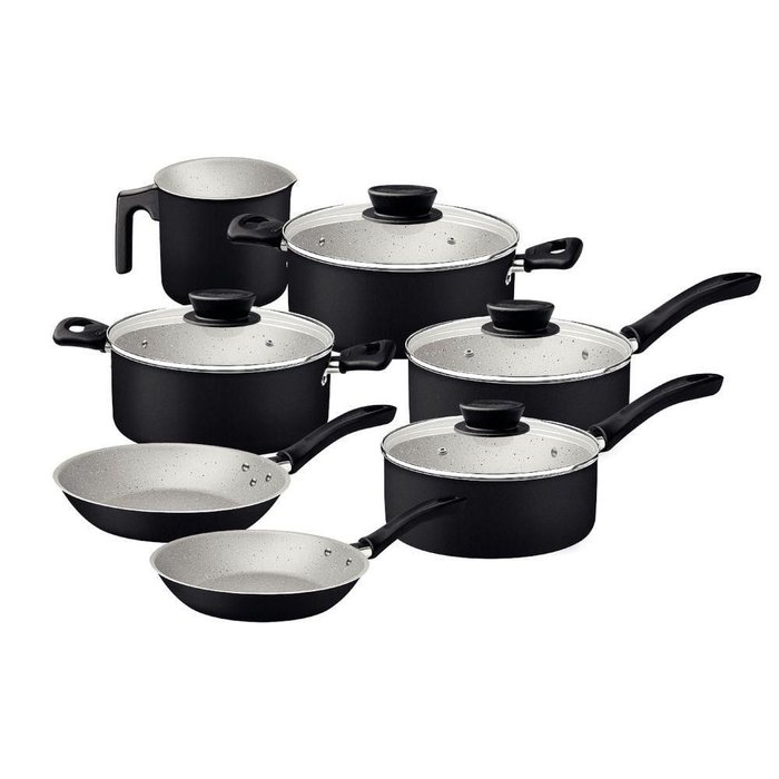 Composição : 1 Caçarola ø 18 cm 2 L;1 Caçarola ø 20 cm 2,8 L;1 Fervedor ø 12 cm 1,1 L;1 Frigideira ø 16 cm 0,4 L;1 Frigideira ø 20 cm 0,8 L;1 Panela ø 16 cm 1,4 L;1 Panela ø 18 cm 2 L;