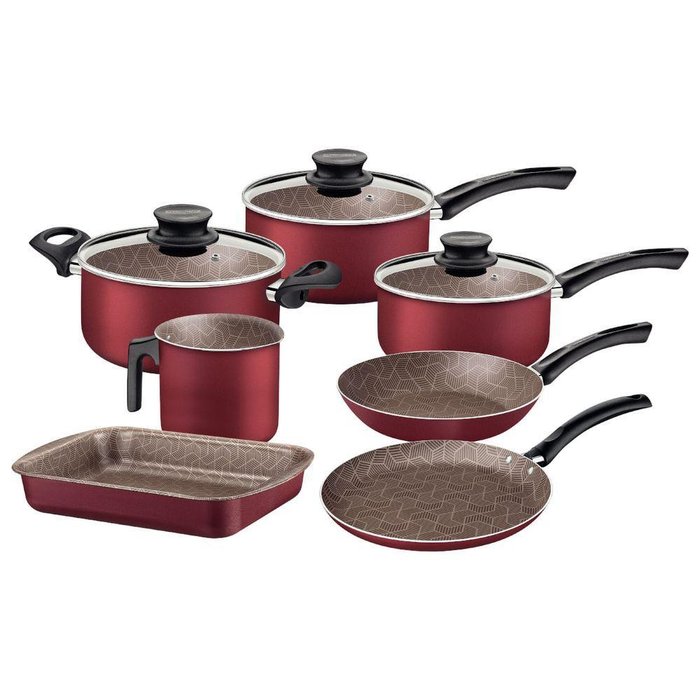Composição - 1 Assadeira Funda 28 cm 3,3 L;1 Caçarola Ø 20 cm 2,9 L;1 Fervedor Ø 12 cm 1,2 L;1 Frigideira Ø 20 cm 0,8 L;1 Panela Ø 16 cm 1,5 L;1 Panela Ø 18 cm 2,1 L;1 Panquequeira/ Tapioqueira Ø 22 cm 0,6 L.