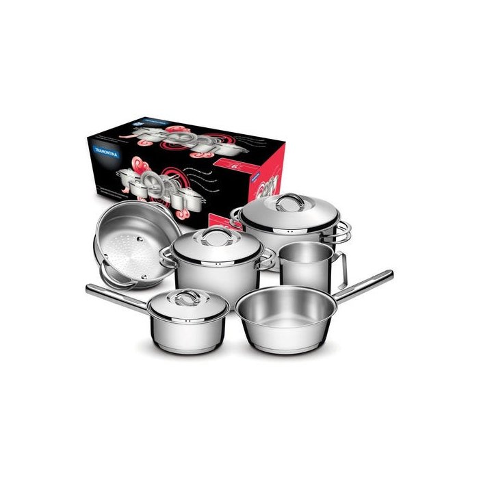 O Jogo de Panelas Tramontina Solar em Aço Inox com Fundo Triplo e Tampas de Inox 6 Peças é um clássico Tramontina. Práticas e duráveis, as seis peças são produzidas totalmente em aço inox, que mantém os alimentos saudáveis já que o material não solta resíduos. Possuem fundo triplo (aço inox + alumínio + aço inox), característica que distribui o calor de forma uniforme, proporcionando um cozimento mais rápido e deixando os alimentos aquecidos por mais tempo, além de economizar mais energia. São peças versáteis que podem ir ao forno para gratinar ou finalizar pratos na temperatura máxima de 260°C e ser utilizadas em diferentes tipos de fogões. ******O fervedor não é indicado para o fogão à indução******. Possuem tampa com encaixe perfeito e saída de vapor. São ainda muito estilosas. O acabamento em alto brilho faz delas as melhores escolhas para uma cozinha mais bonita. São fáceis de limpar devido ao desenho sem cantos, além de poderem ir à máquina de lavar louças diariamente. A escolha perfeita para ter um cozinha muito mais completa!