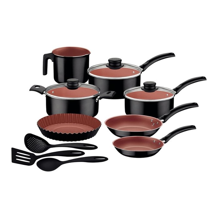 A Linha Turim sempre faz sucesso na sua cozinha. Além da praticidade do cozimento uniforme, proporcionado pelo revestimento interno de antiaderente Starflon Max, elas permanecem bonitas por muito mais tempo. Podem ser utilizadas em fogão a gás e elétrico e vitrocerâmicos. Revestimento interno de antiaderente Starflon Max que não gruda, mais durável e não é prejudicial à saúde, pois é livre de PFOA. O Conjunto de panelas Tramontina acompanha utensílios de nylon resistentes à temperaturas de até 180C, sendo 1 Colher para servir, 1 Espátula e 1 Espumadeira. Recomendações de uso: A capacidade volumétrica máxima para cozimento é de 3/4 da capacidade total da peça. Em fogões com grade, centralize as peças sobre a chama ou fonte de calor e alinhe os cabos com a grade. Linha: Turim Cor: Preto Material Corpo: Alumínio Material das tampas: Vidro Temperado e Aço Inox Material das alças: Baquelite antitérmico Material dos Cabos: Baquelite antitérmico Revestimento interno: Antiaderente Tipo de revestimento: Starflon Max Indicação de uso: Cozinha Capacidade do Fervedor: 1,2L Capacidade da Frigideira 20cm: 0,8L Capacidade da Frigideira 16cm: 0,4L Capacidade da Panela 16cm: 1,4L Capacidade da Panela 18cm: 2L Capacidade Forma Bolo/Torta 24cm: 1,4L Capacidade da Caçarola 18cm: 2L Quantidade de peças: 10 Pode ser Levado a Fornos Elétrico ou à Gás : Sim Pode ser Levado a Fogão de Indução: Não Pode ser Levado ao Microondas: Não Pode ser Levado a Lava-Louças: Não Selo de Homologação: Inmentro Marca: Tramontina Conteúdo da embalagem: 1 Jogo de Panelas Dimensões aproximadas do produto: 20 x 29 x 48,2 cm (A x L x P) Dimensões aproximadas da embalagem: 21 x 30 x 49 cm (A x L x C) Peso aproximado do produto: 3,18 Kg Peso aproximado da embalagem: 3,3 Kg Informações Adicionais: Proporciona cozimento rápido e uniforme Informações Importantes: - Os objetos que ambientam as imagens, não acompanham o produto. - Atenção: As cores das imagens podem sofrer alterações devido a luminosidade, configurações do monitor e até mesmo a percepção do usuário.