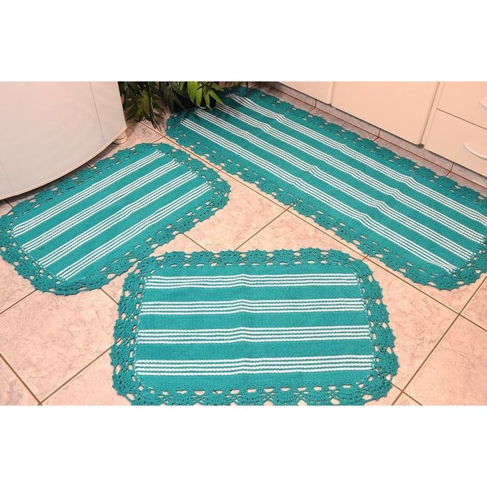 Jogo de Passadeira de Tear com Bico de Crochê - Azul Deixe sua cozinha linda com este delicado tapete! Jogo em tear na cor azul e branco, com detalhes em listras e um lindo acabamento em bico de crochê na cor azul.Explore o seu bom gosto e deixe fluir sua criatividade redecorando sua casa com os produtos Arte & Tear. Esse produto trará um diferencial para sua casa e deixará o seu ambiente mais sofisticado! Para você que procura deixar a sua cozinha bem decorada como os outros espaços da sua casa, esse tapete será a combinação perfeita para seus móveis e também um ambiente agradavel para receber sua família e seus amigos. Formado por:1 passadeira de tear 0,45 x 1,45 m2 tapetes de tear 0,45 x 0,70 m Composição:100% algodão