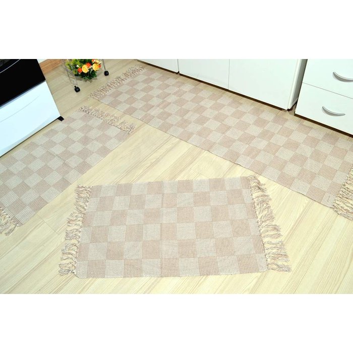 Jogo de passadeiras fabricadas em tear nas cores caqui, branco e mesclado, com franjas e detalhes quadriculados.