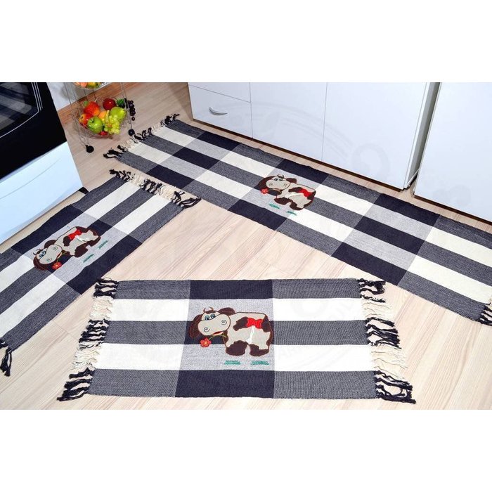 Jogo de Passadeiras Patchwork Vaquinha com LaçoUma graça esse conjunto de passadeiras para enfeitar a sua casa! Jogo de passadeira fabricado em tear em xadrez marrom, com uma graciosa vaquinha com laço bordada em pacthwork em tons de marrom e acabamento em franjas em duas laterais.Está procurando um produto para deixar o seu ambiente mais descontraído e elegante? Esse jogo é a opção certa, com suas cores vibrantes e charmosas vai atender todas as suas expectativas. Eles servem para proteger os pés do frio, esconder pequenas imperfeições do piso, evitar acidentes e traduzir o estilo do dono da casa. Invista você também em peças que tragram sua personalidade com delicadeza para o seu lar. Na Arte & Tear você encontra ótimas opções como a que você está vendo. Invista e transforme sua casa! Formado por:1 passadeira de tear 0,42 x 1,75 m2 tapetes de tear 0,42 x 0,87 m Composição:85% algodão no mínimo