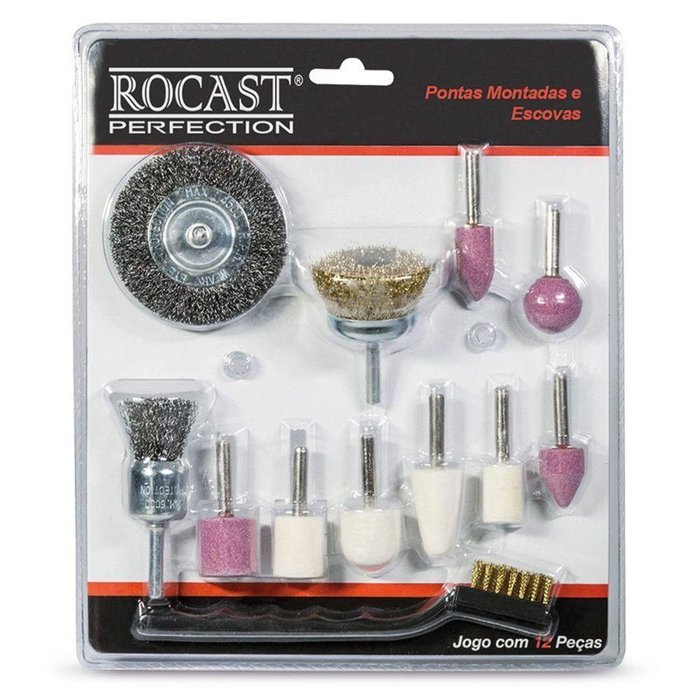 Jogo De Pontas Montadas e Escovas - Jogo Com 12 Peças-ROCAST O Jogo de Pontas Montadas e Escovas são peças indicadas para retificar, desbastar, polir e limpar pequenas peças. Utilizado em furadeiras. Apresentação: Blister autosserviço.