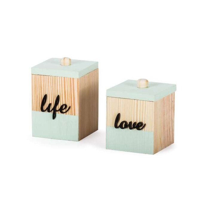 Jogo de potes com tampa, produzido artesanalmente em madeira de pinus, decorado com aplique das palavras "life" e "love" e detalhes na cor menta.