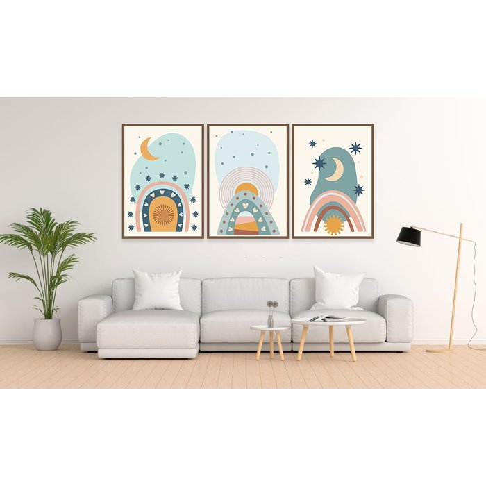 Jogo de Quadros Decorativos Triplo Molduras Marília Minimalista Lua Sol - 40cm Largura x 60cm Altura Tabaco