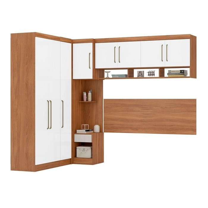 Conteúdo da Embalagem: 1 Guarda Roupas 2 Portas, 1 Guarda Roupa de Canto, 1 Mesa de Cabeceira Alta, 1 Painel de Cabeceira, 1 Armário Ponte Casal, manual de e acessórios