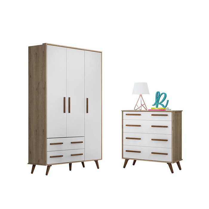 Jogo de Quarto com Cômoda e Roupeiro Retrô Branco/Carvalho - FdECOR Branco/Carvalho