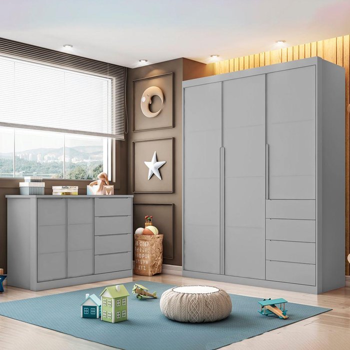 Jogo De Quarto Completo Pérola Cinza - Phoenix Baby O Jogo de Quarto Pérola é ideal para você que busca qualidade e modernidade em um único móvel para compor o quarto de seu filho. Produzido em MDF 15mm e acabamento em pintura UV (Brilho) atóxica. O Guarda Roupa possui 03 portas de bater com dobradiças metálicas, 04 gavetas com corrediças telescópicas, puxadores cava e um amplo espaço interno para acomodar as roupas e acessórios de seu bebê. A Cômoda possui 02 portas de bater com dobradiças metálicas, 04 gavetas com corrediças telescópicas, cabideiro (montagem opcional), puxadores cava e um amplo espaço interno de armazenamento. Um conjunto com muito charme e cheio de detalhes que irá deixar o ambiente ainda mais encantador.
