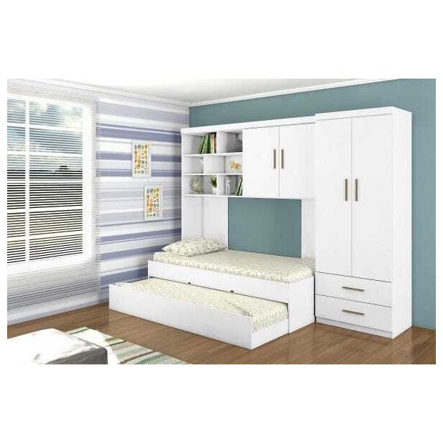 Jogo de Quarto Chiara 4 Peças - Guarda Roupa 2 portas, Módulo Aéreo com 2 portas e Cama com cama Auxiliar - Phoenix Baby Tenha espaço de sobra no quarto de seu filho ou filha com esse jogo completo e guarde tudo que for preciso. Com esse kit de guarda roupa 2 portas, módulo aéreo com varias prateleiras, cama e cama auxiliar, você vai poupar espaço e ainda deixar tudo muito organizado. Isso tudo só é possível com a mais nova linha de Móveis da Phoenix Baby. Características: Fabricado em MDP. Cor branca, acabamento laqueado e Pintura em UV Alto Briho atóxica. NÃO INCLUI COLCHÃO Dimensões: Tamanho do Roupeiro ( L x A x P ) 73 x 200 x 38 cm Tamanho do Aéreo ( L x A x P ) 195 x 200 x 38 cm Tamanho da Cama ( L x A x P ) 193 x 45 x 92 cm Tamanho da Cama Auxiliar ( L x A x P ) 190 x 25 x 90 cm Dimensões colchão: ( NÃO INCLUSO ) Cama: 88 x 188 cm. Cama Auxiliar: 78 x 188 cm. Garantia: 3 meses contra defeito de fabricação Volumes: 7 Volumes Montagem: O Produto vai desmontado com manual e todos acessórios. Recomendamos que a montagem seja feita por um profissional. A Kangaroo Baby Kids não se responsabiliza pela montagem dos produtos. Todos os produtos acompanham manual de instruções e acessórios para que seja montado.- Não nos responsabilizamos, no ato da entrega, por subir escadas/elevadores ou transporte por guincho em apartamentos. Eventuais despesas são de responsabilidade do comprador.- Confira as dimensões deste produto e certifique-se de que passará normalmente por supostos elevadores, portas, escadas e/ou corredores de sua residência.- Para mais informações, acesse nossa Central de Atendimento.