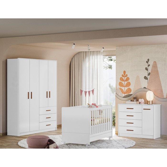 O Dormitorio Perola Peternella e produzido em MDP bio-sustentavel. Seu berco/mini cama e aprovado e certificado conforme regulamento do Inmetro, a comoda e roupeiro contam com sapatas plásticas. É um quarto espaçoso, prático e funcional... é o produto ideal para você. Sua pintura UV é feita diretamente na madeira tratada, proporcionando assim um acabamento melhor aos móveis.