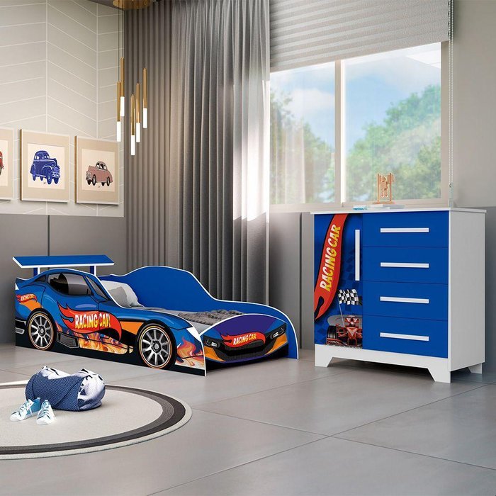 Jogo de Quarto Infantil Cama e Comoda Carro Personagens Azul Azul
