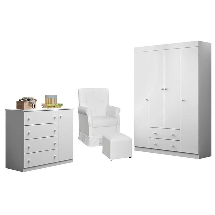 Jogo de Quarto Infantil com Poltrona de Amamentação Suzi com Balanço e Puff Branco - PR Baby
