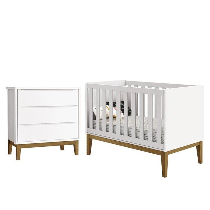 Jogo de Quarto Infantil Cômoda 3 Gavetas e Berço Classic Branco Fosco com Pés Amadeirado - Reller Mó