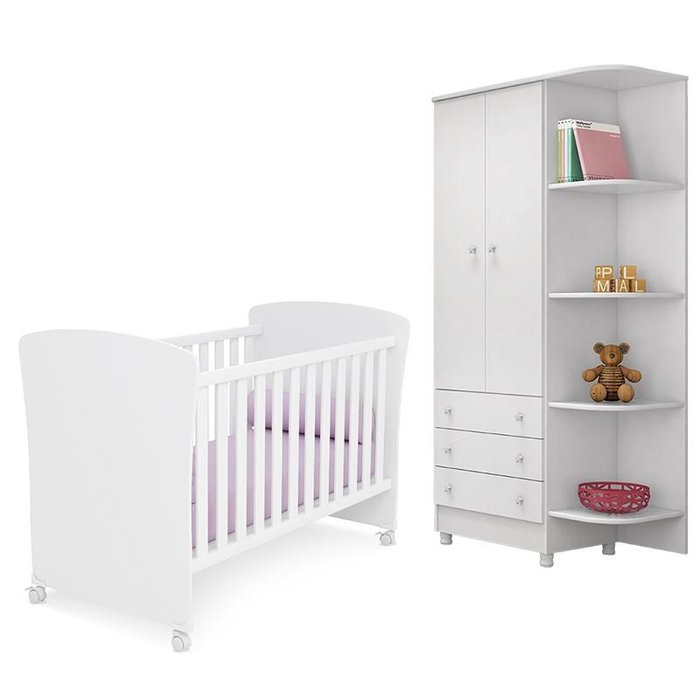 Jogo de Quarto Infantil Doce Sonho Guarda Roupa 2 Portas e Berço Americano Branco com Rodízio - Qmov
