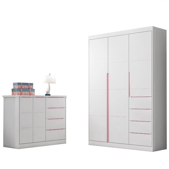 Jogo de Quarto Infantil Eloá com Guarda Roupa e Cômoda Branco/Rosê - Phoenix Baby